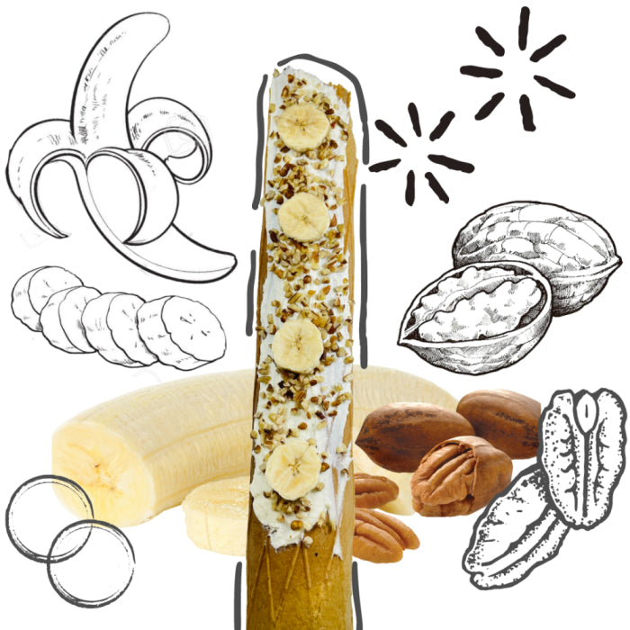 Marquesita súper crujiente con plátano de Tabasco, nuez de Delicias (Chihuahua), queso crema y cajeta de Guanajuato.